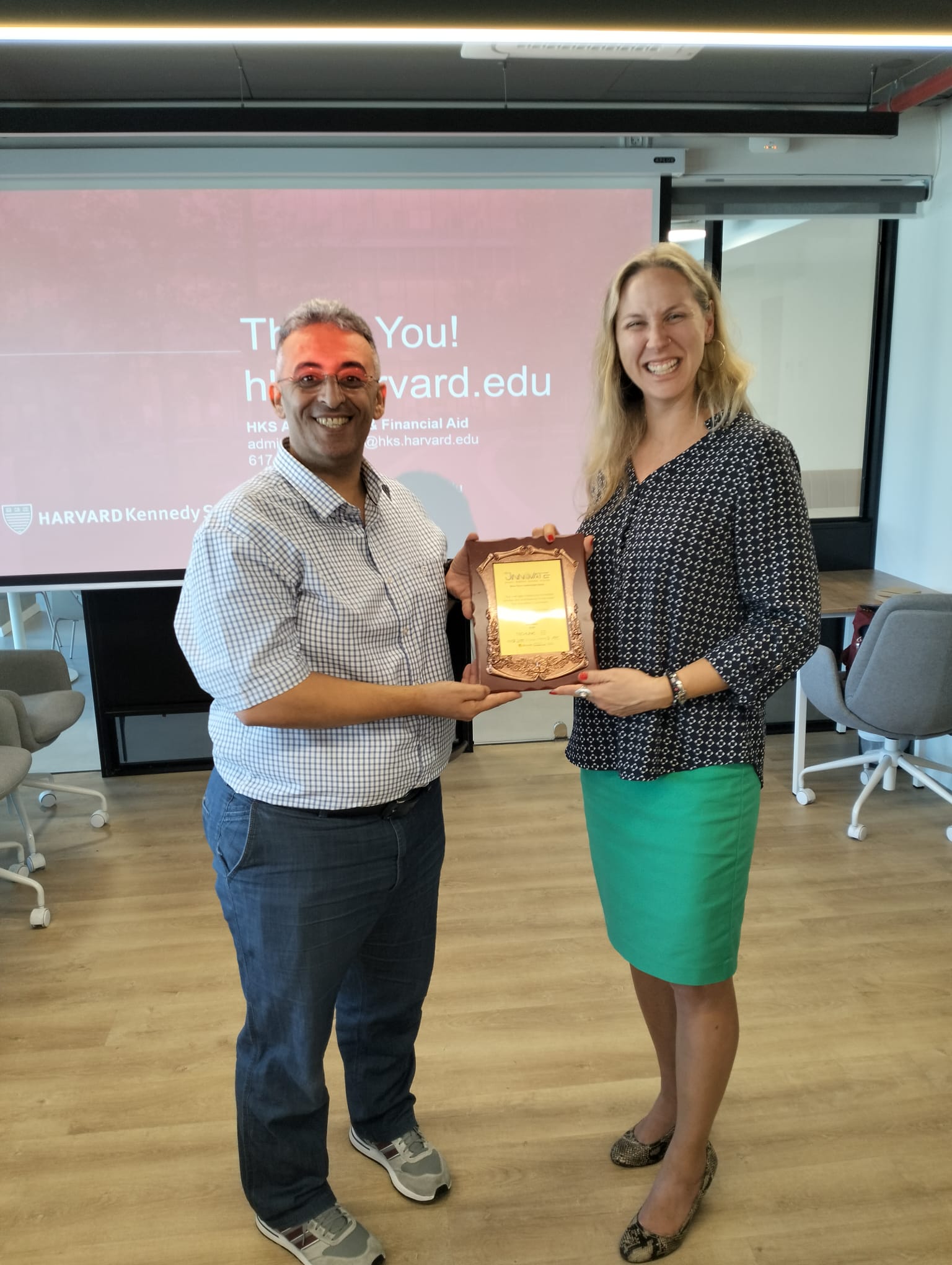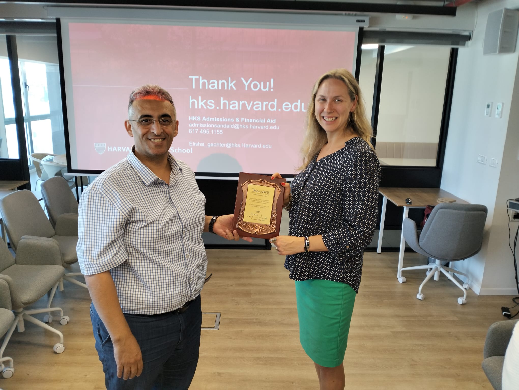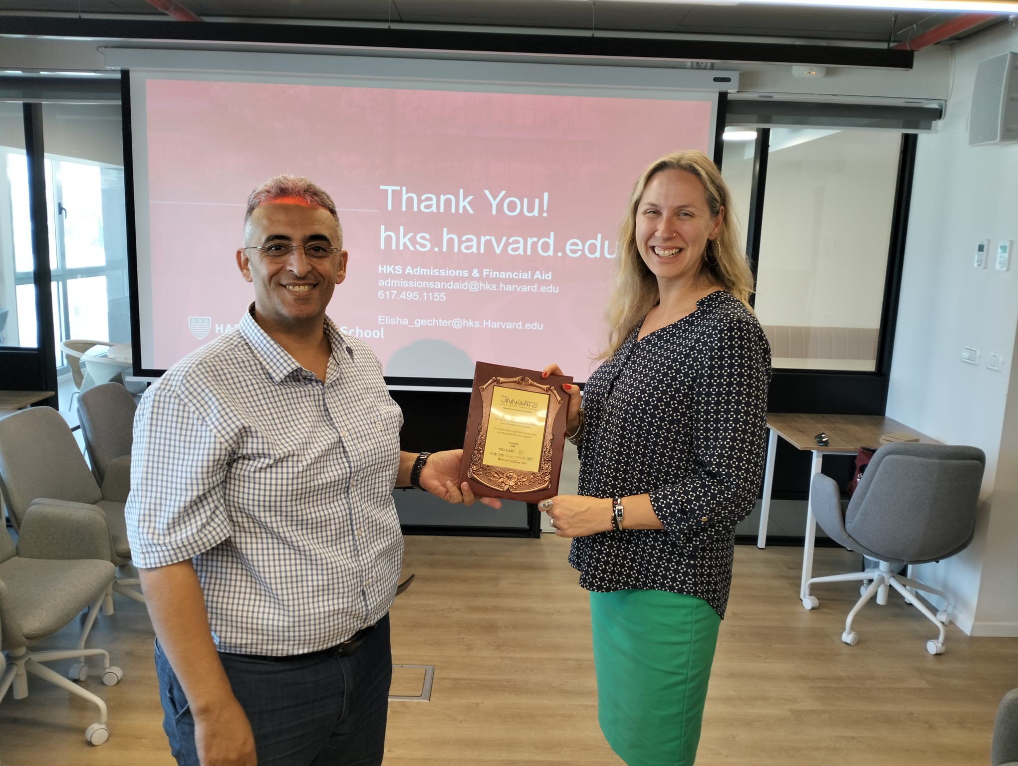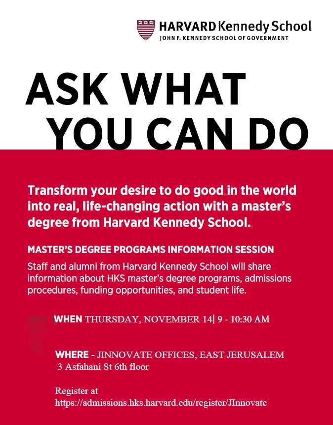 JINNOVATE proudly hosted a special session with partners from Harvard Kennedy School (HKS) on November 14, 2024, at its Jerusalem offices. Led by Elisha Gechter, Senior Program Manager for Fellowships Curriculum, the session provided essential information on HKS Master’s Degree programs, including admissions, student life, financial aid, and fellowships for Israeli and Palestinian students. JINNOVATE’s Founder and CEO, Mahmoud Khweis, an HKS alumnus, joined the session, underscoring Jinnovate’s commitment to bridging opportunities for young people in East Jerusalem and surrounding areas, connecting them with top global institutions